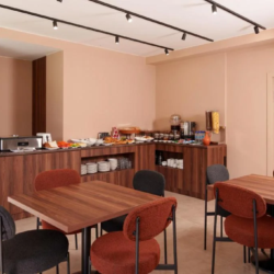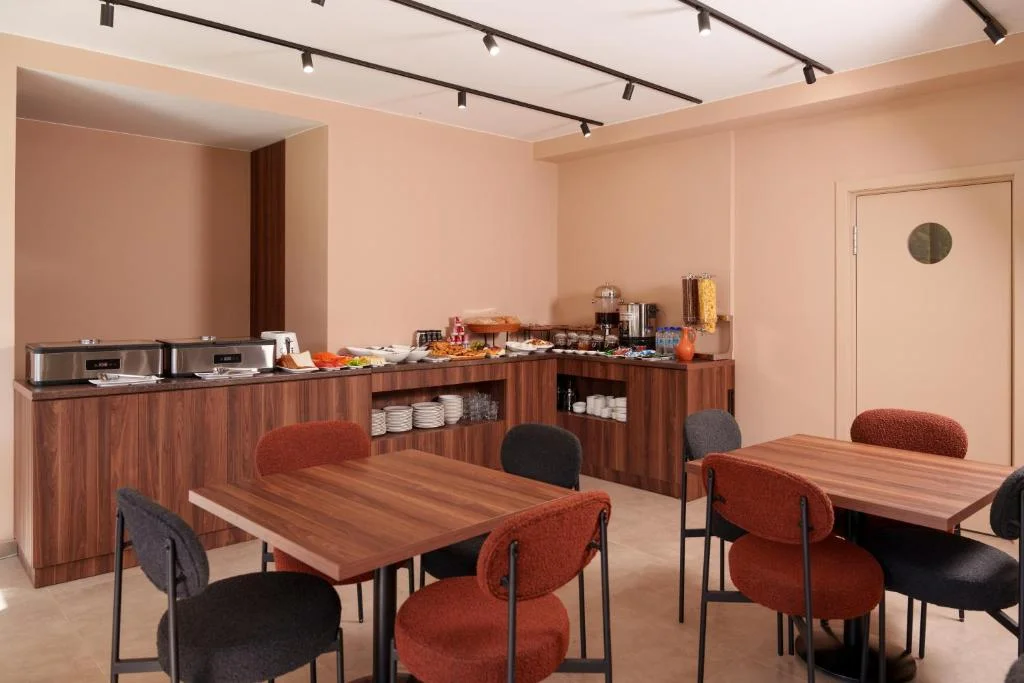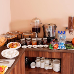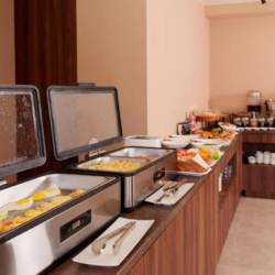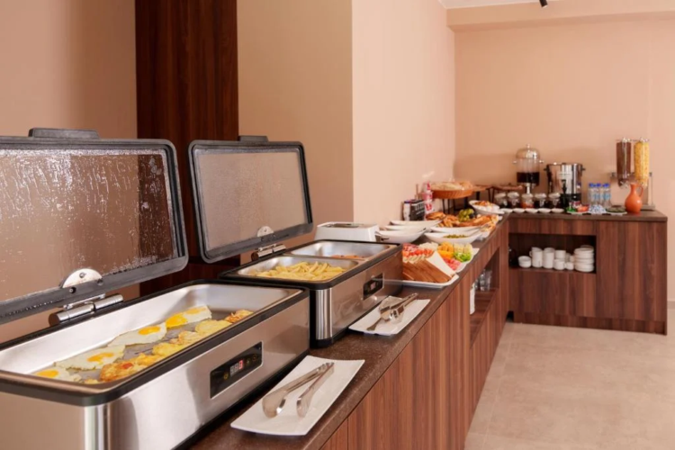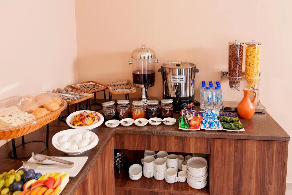 A daily buffet breakfast is served, featuring a selection of warm dishes, fresh pastries, pancakes, cheese, fruits, juices, and more.